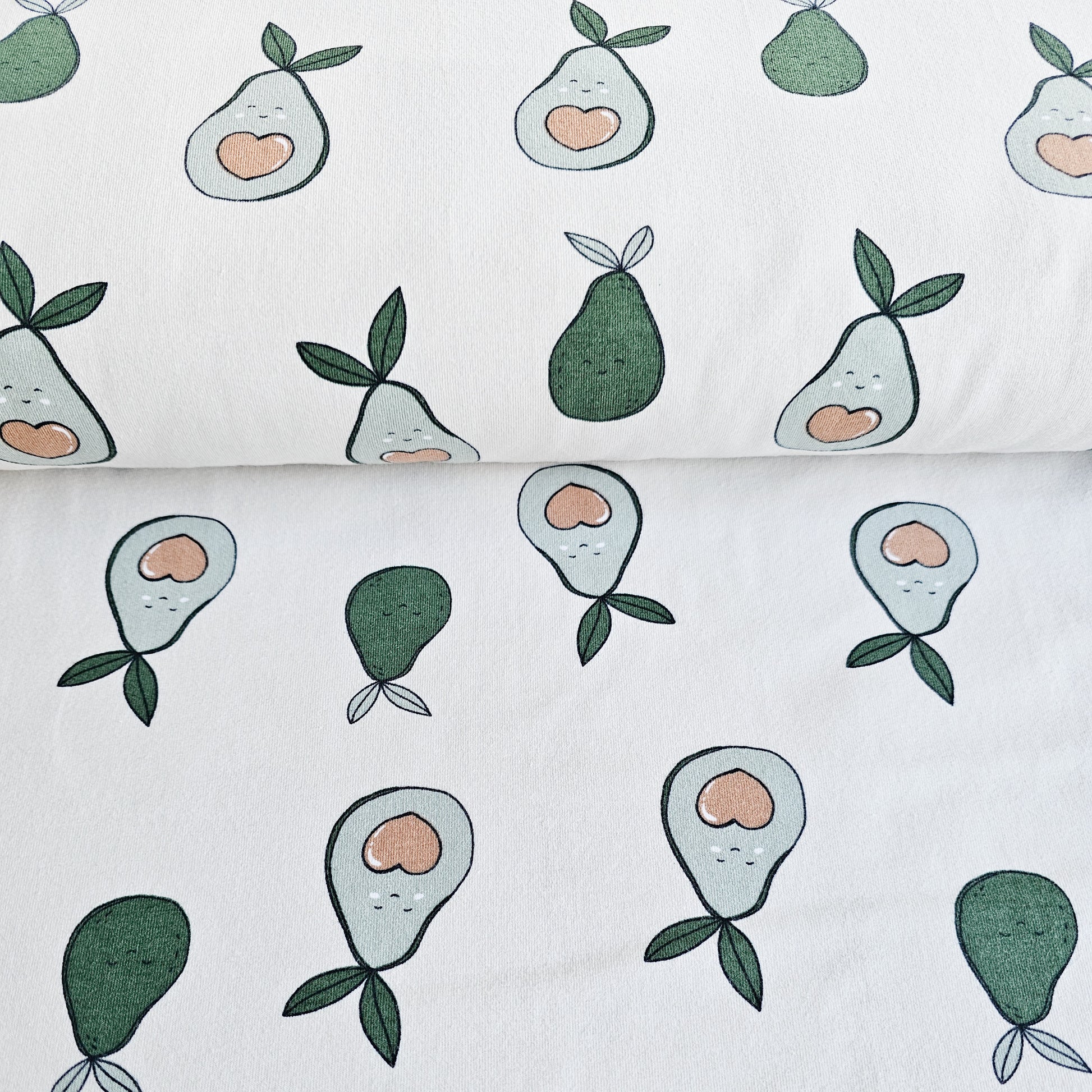 Wunderschöner Bio-Baumwolljersey in hellbeige mit Avocados.