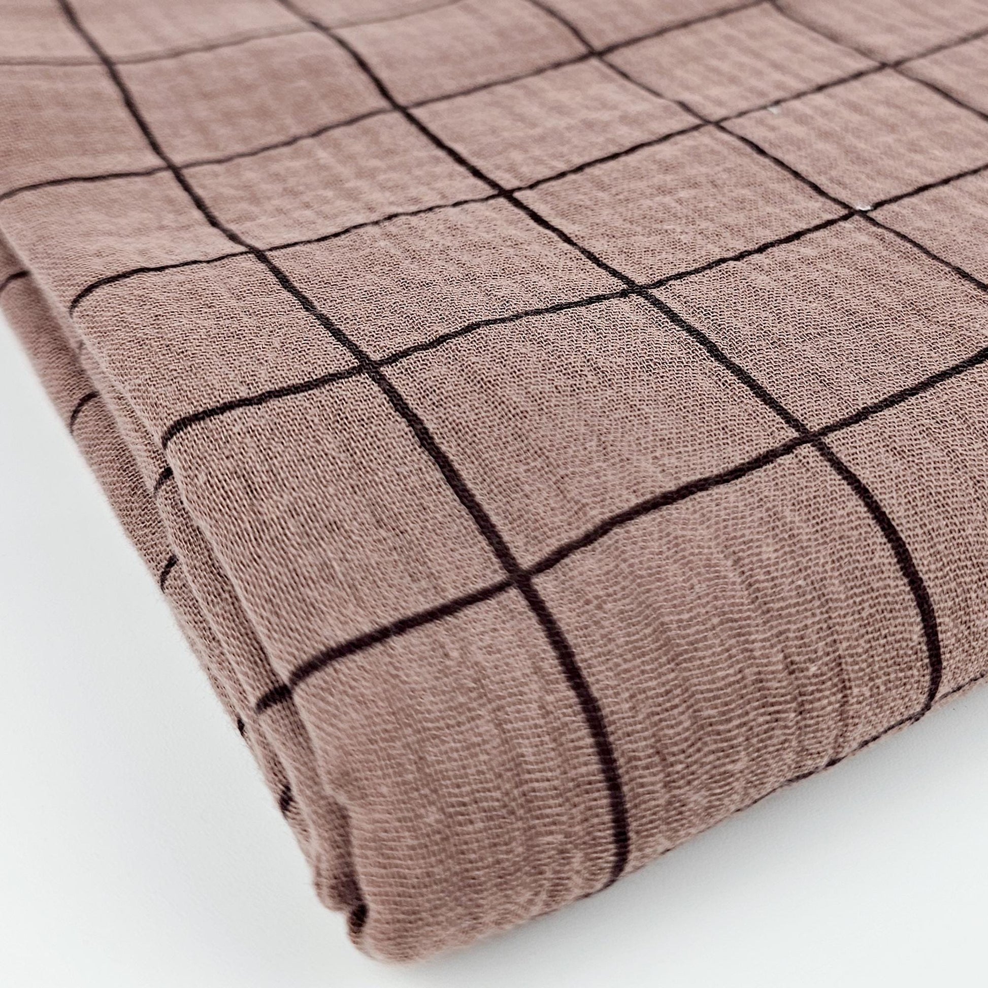 Schöner Musselin aus 100% Baumwolle in Kastanienbraun mit dunkelbraunem Karo-Muster.