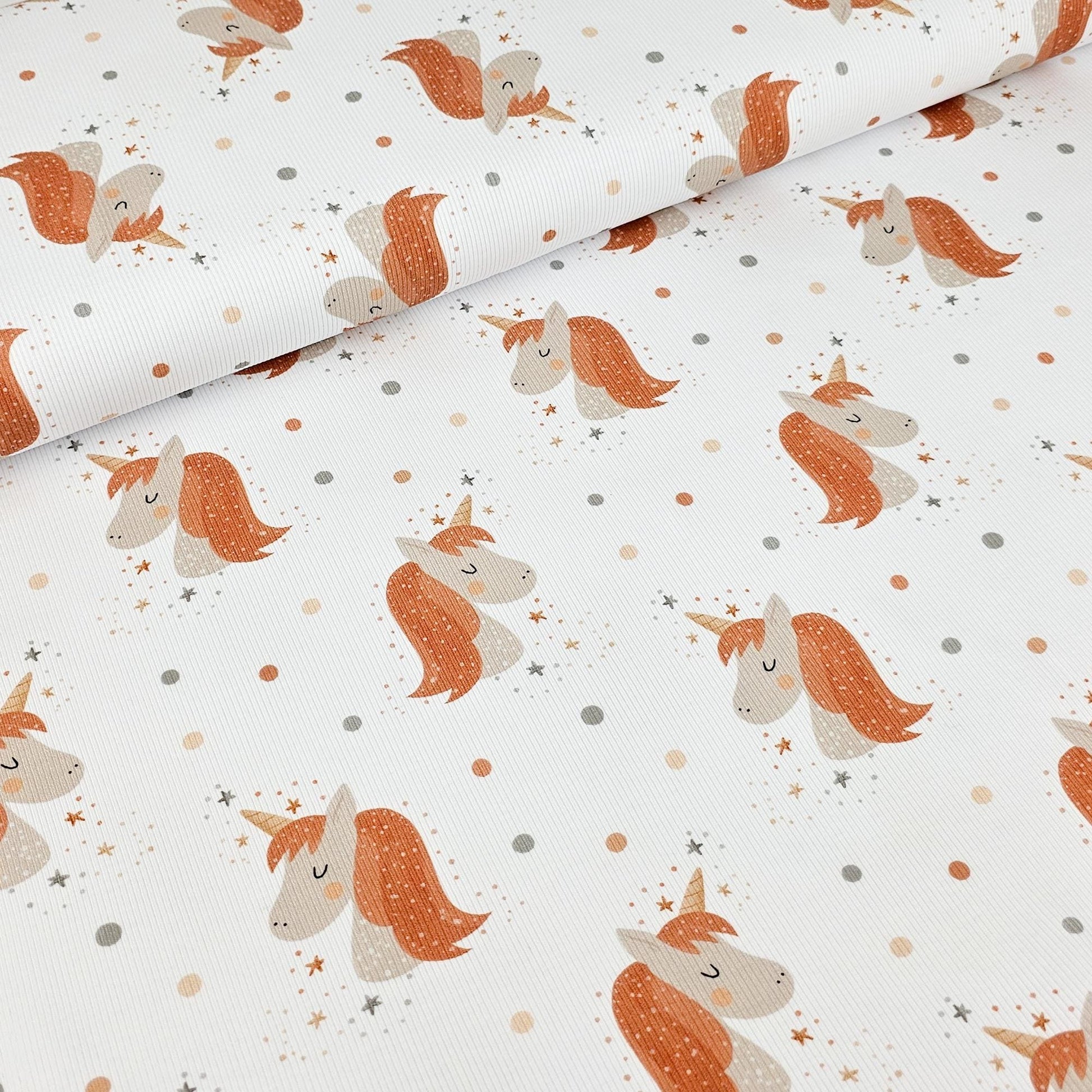 Wunderschöner elastischer Rippenjersey in ecru weiß mit Einhörnern und Konfettipunkten. Farblich passt der Rib Jersey in pfirsich oder taupe perfekt dazu.