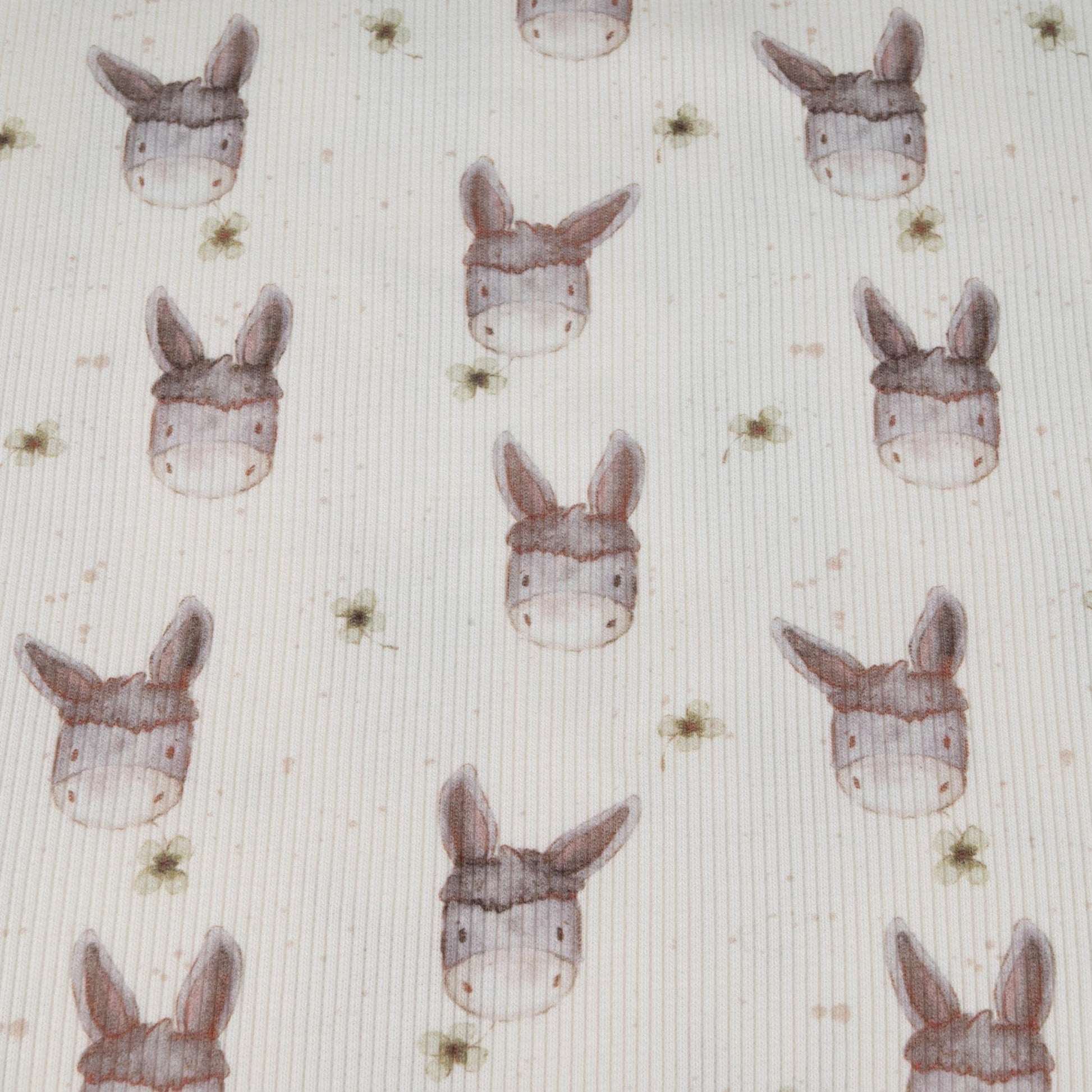 Wunderschöner weicher Baumwoll Rib Jersey in cremeweiß mit Eseln von Family Fabrics.