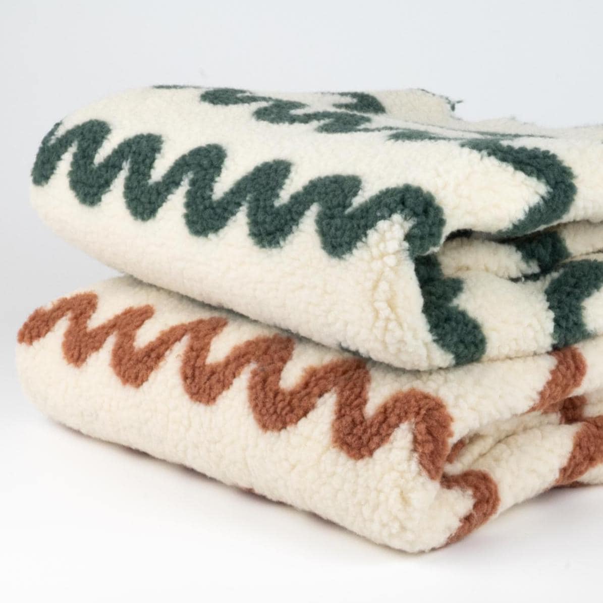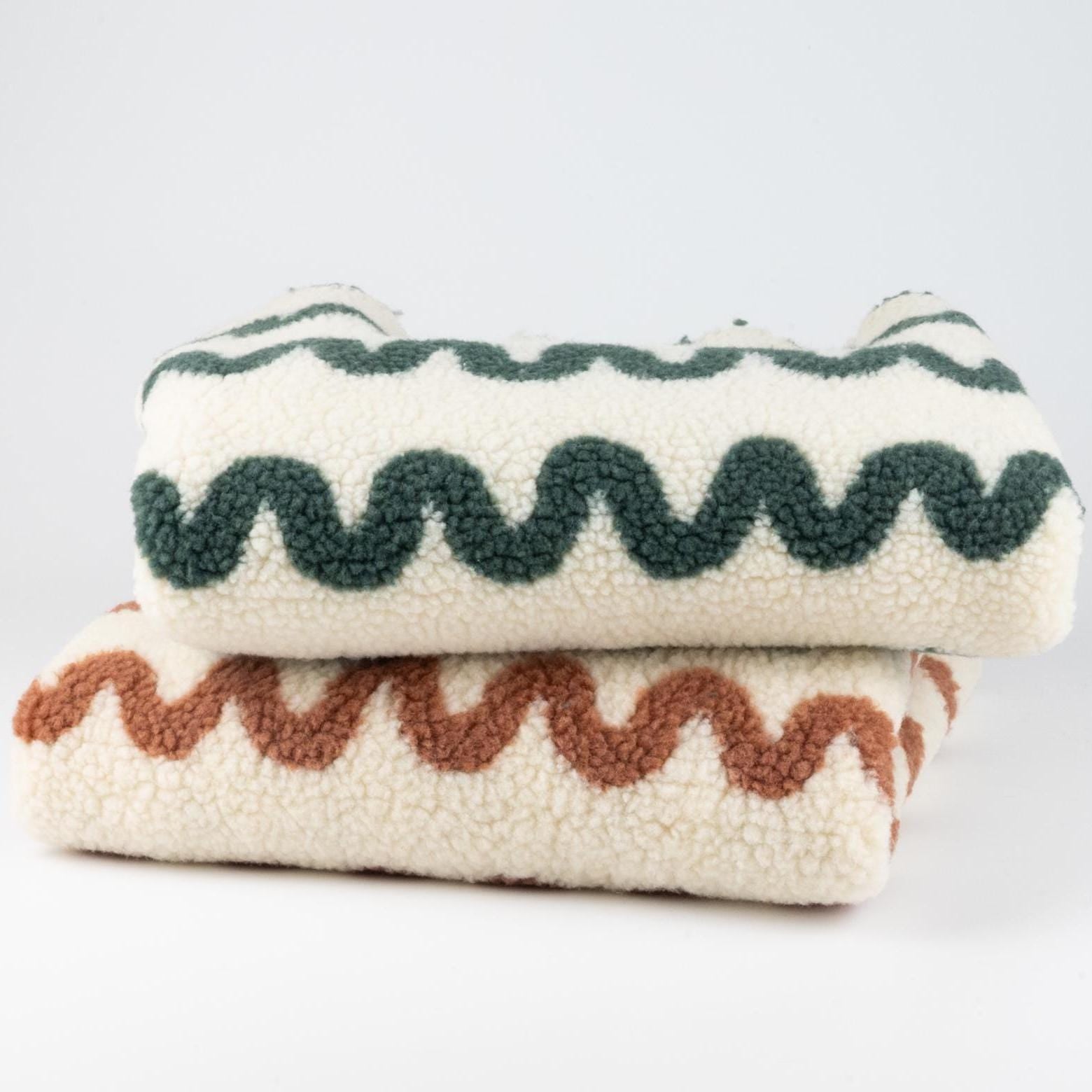 Kuschelweicher Teddy Stoff in cremeweiß mit Wellenmuster in kamelbraun oder dunkel oliv.